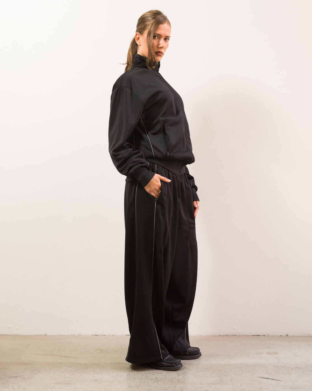 Wide, baggy leg. Elastic waist with contrast piping running the full length of the side seam.