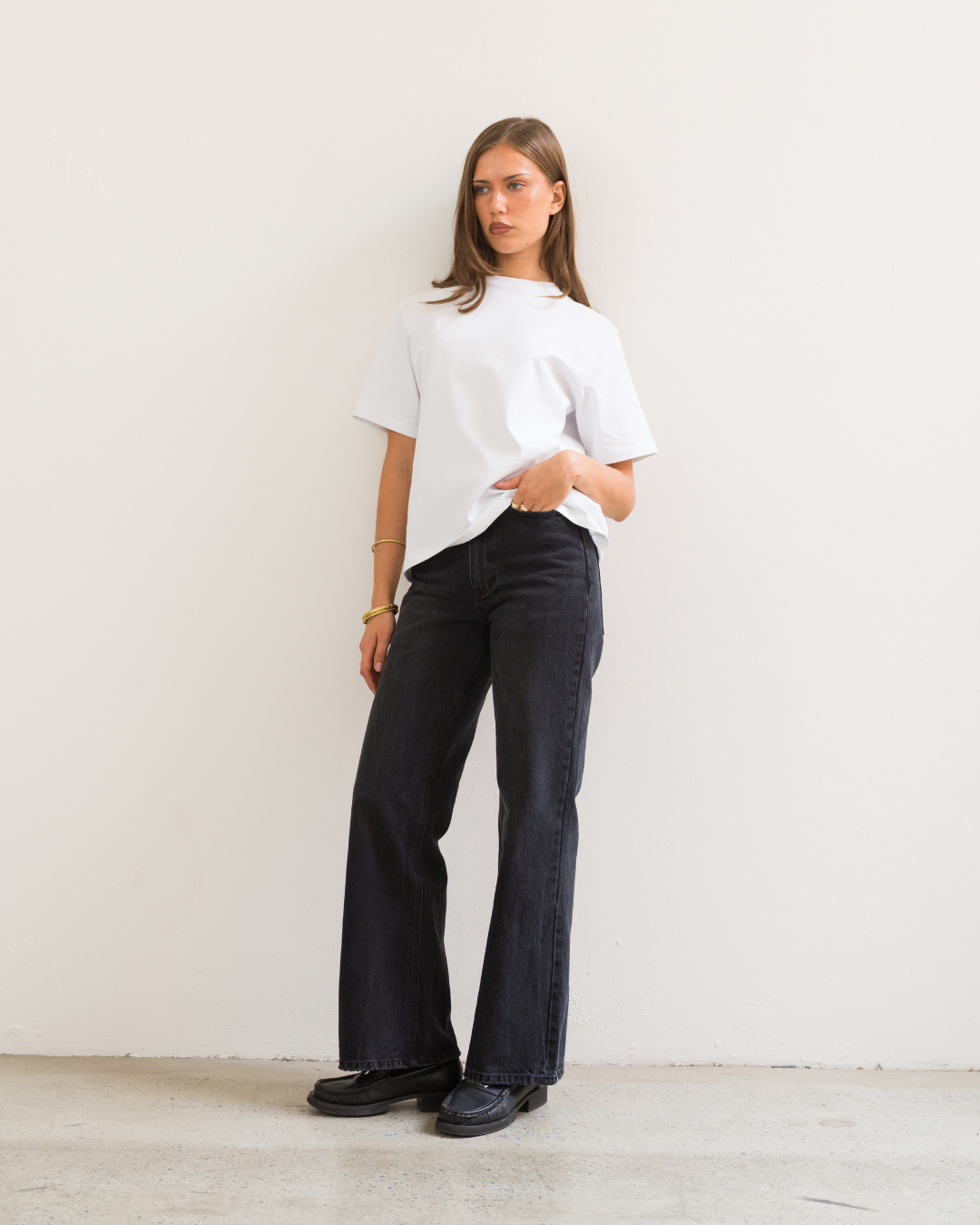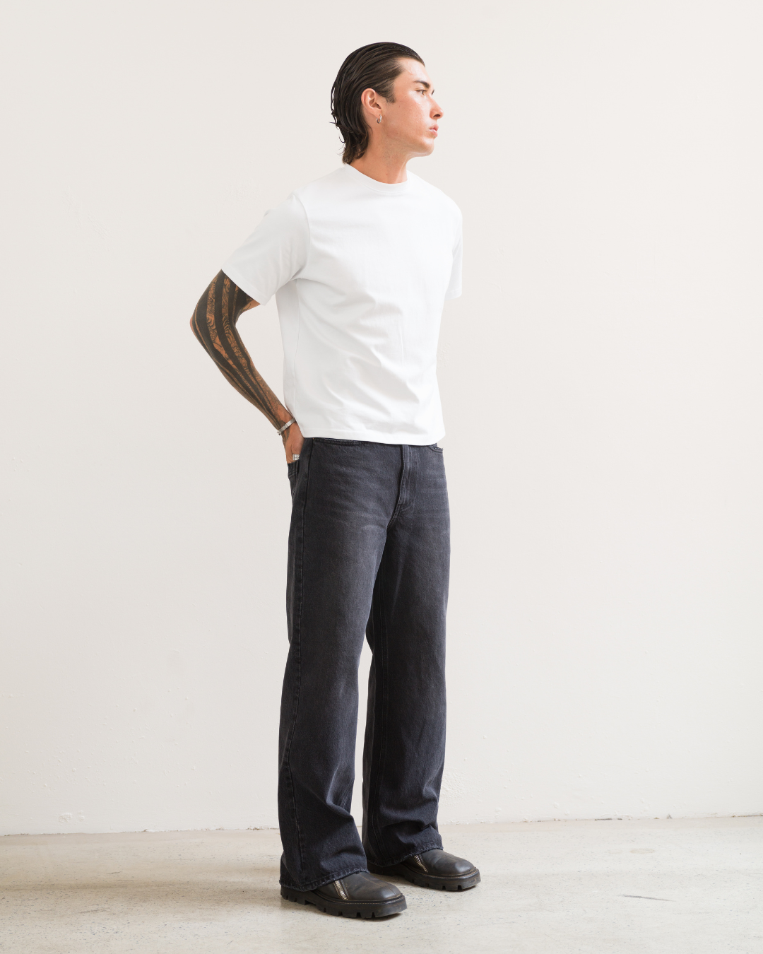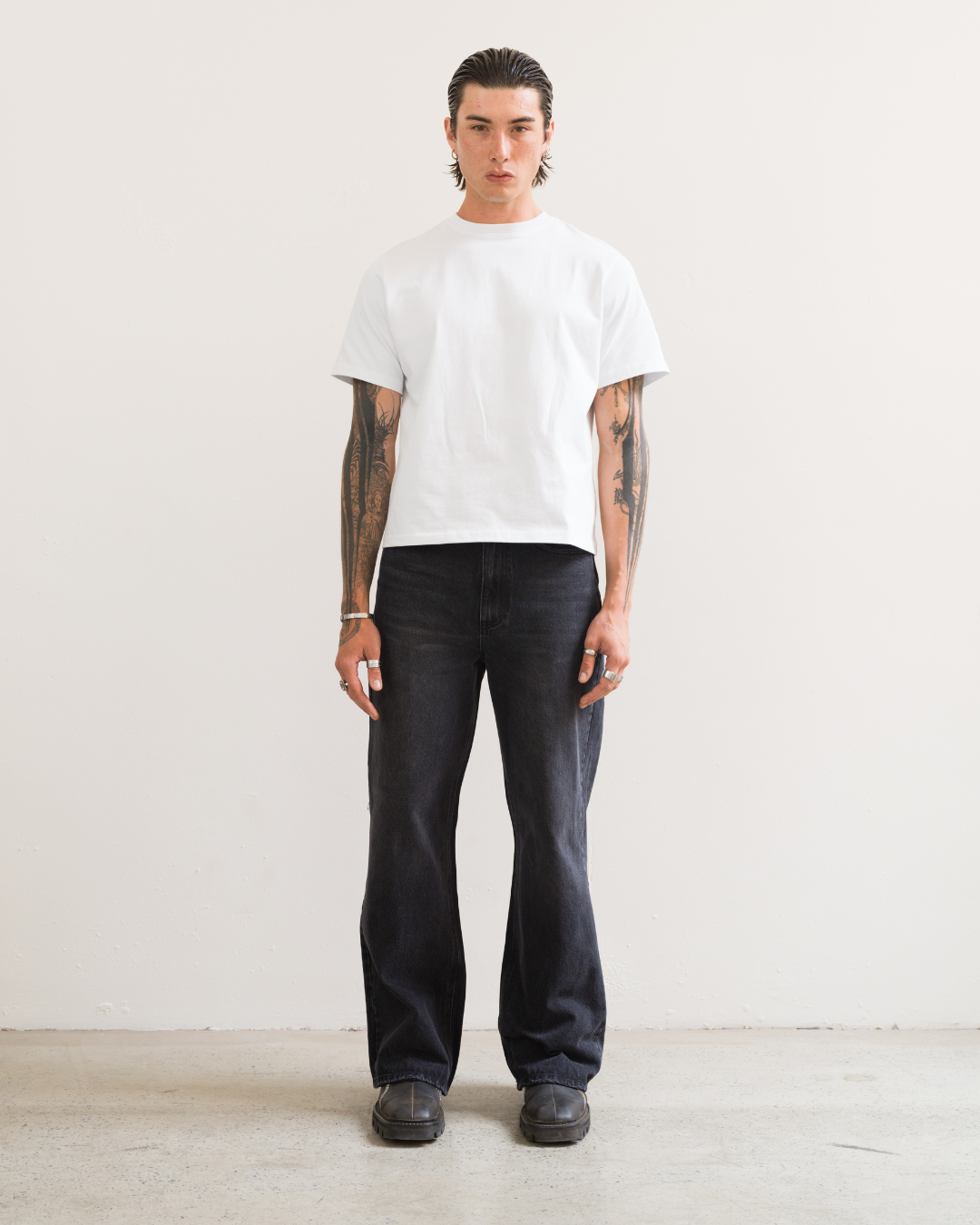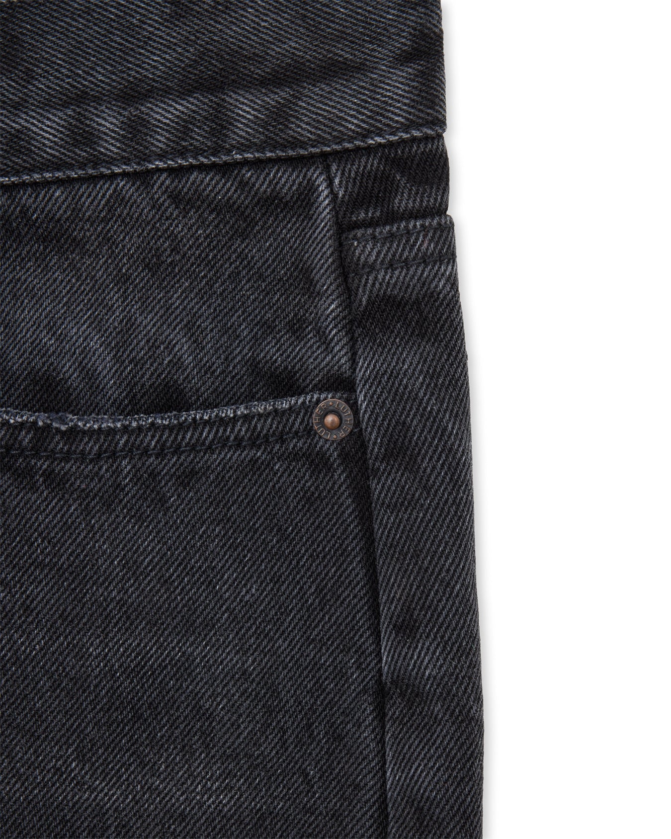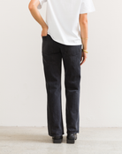 Made from a mid weight black denim with a light vintage wash. Designed with a mid rise and cut to a regular fit, featuring a slight taper through the knee and subtle flare at the hem.