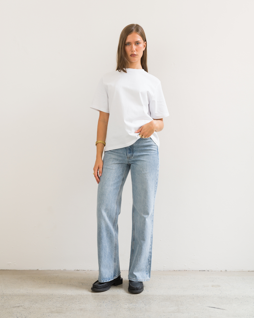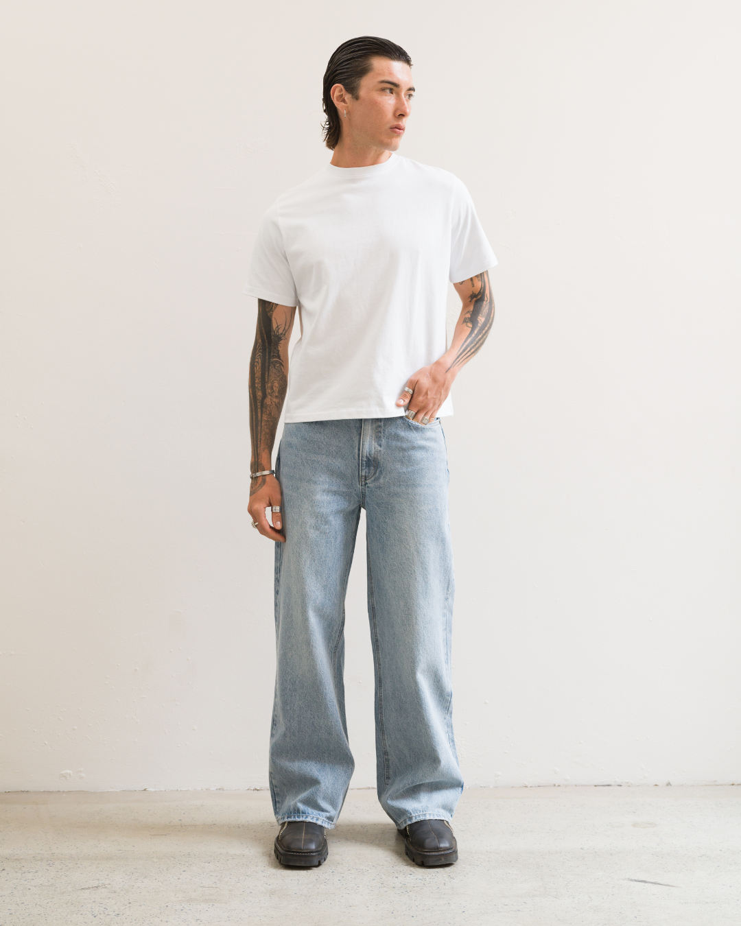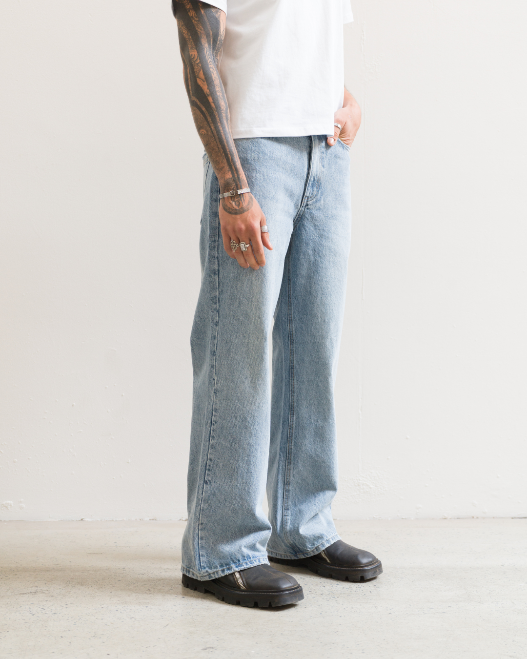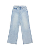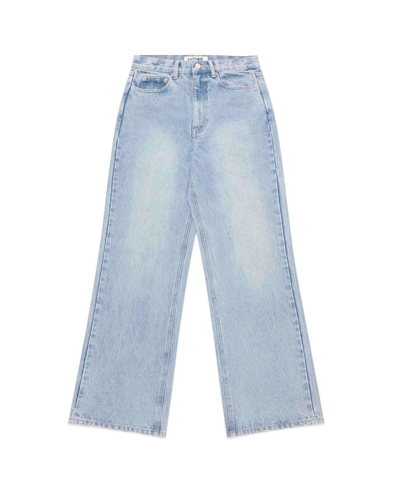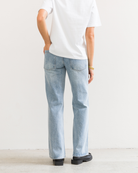Made from a mid weight indigo denim with a light vintage wash. Designed with a mid rise and cut to a regular fit, featuring a slight taper through the knee and subtle flare at the hem.