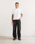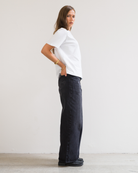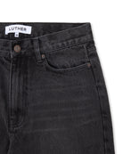 Made from a mid weight black denim with a light vintage wash. Cut to a mid rise, wide straight leg with a long length.